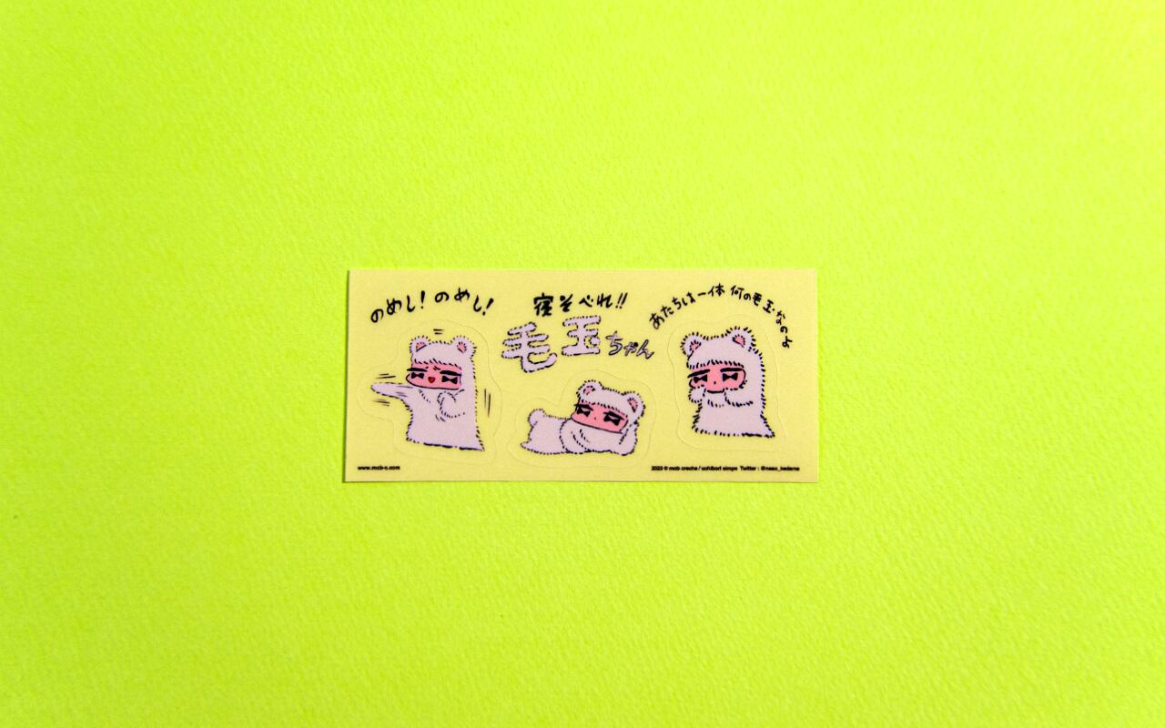 ウチボリシンペが気ままに描いているキャラクター「毛玉ちゃん」のステッカーです。 貼付時、薄黄色の部分が透明になります。 ◼︎商品仕様 サイズ:縦50mm × 横110mm ◼︎注意事項 ・本サイトに掲載している画像はイメージです。 色味など若干違いがある場合がございます。 ・セール品は返品交換をお受けできません。