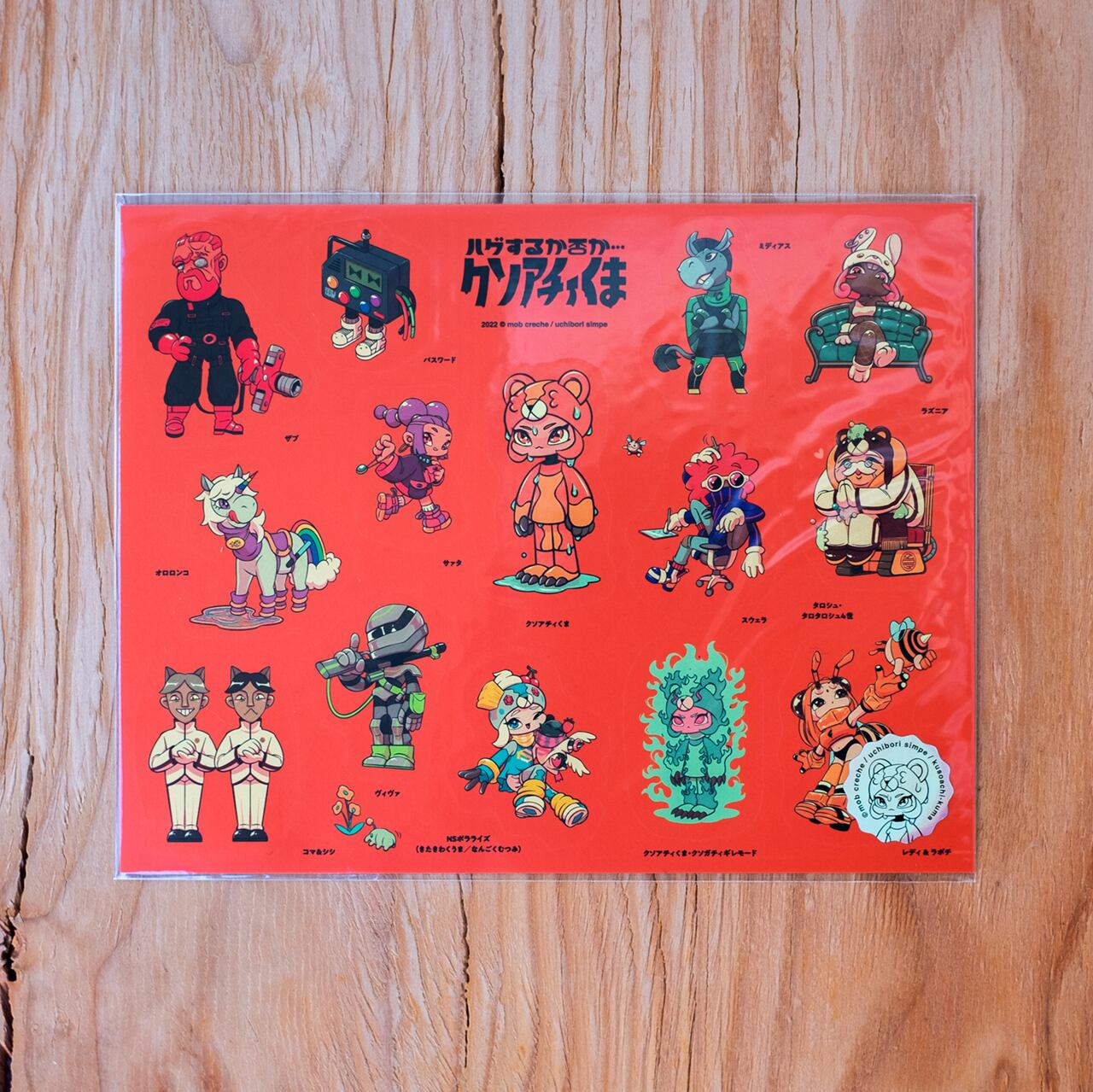 クソアチィくまに登場するキャラクター計14枚が 一枚にまとまったステッカーシートです。 ◼︎商品仕様 サイズ:縦153mm × 横200mm ◼︎注意事項 ・本サイトに掲載している画像はイメージです。 色味など若干違いがある場合がございます。 ・セール品は返品交換をお受けできません。